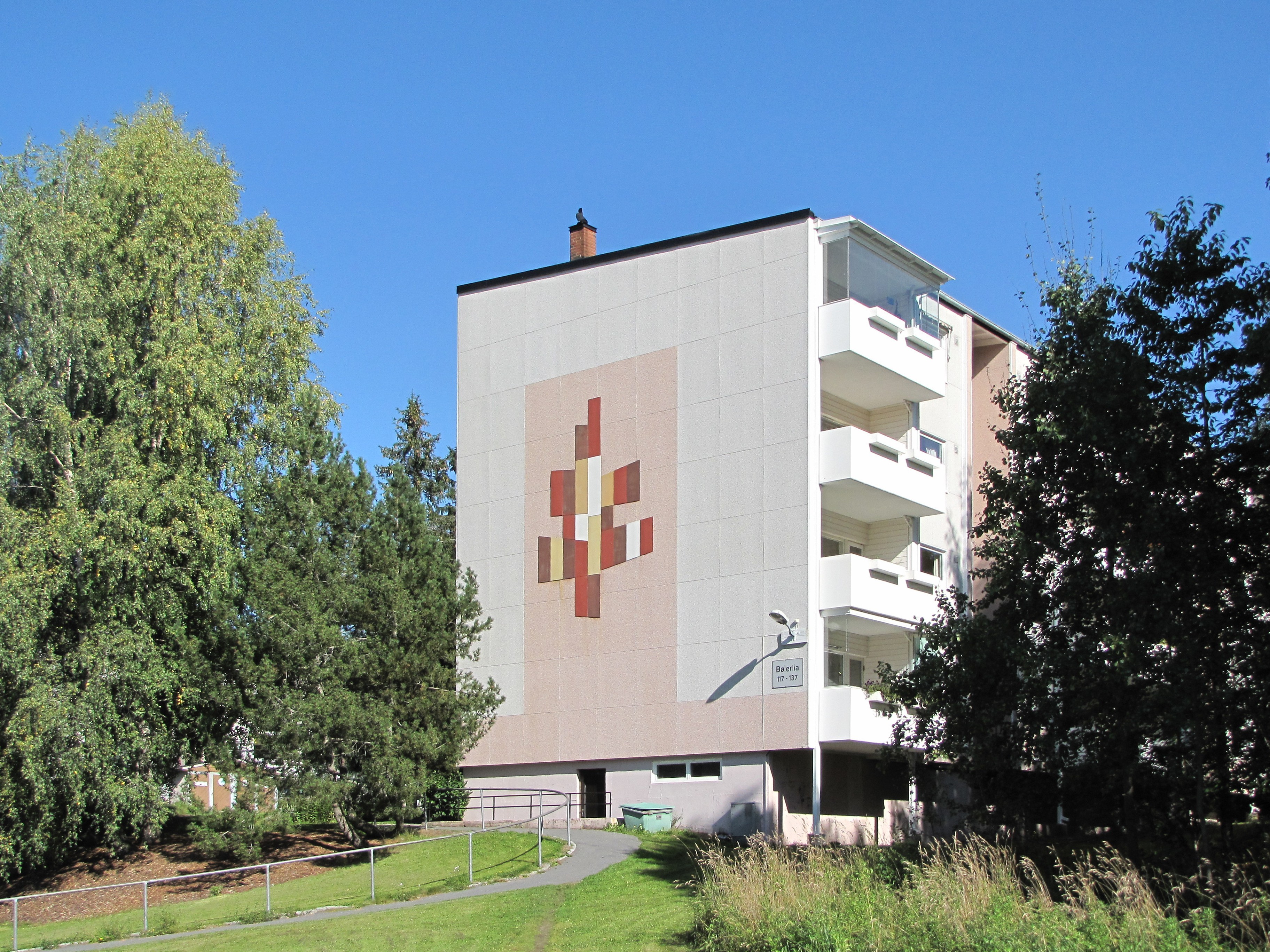 På flere av blokkene på Bøler finnes et geometrisk mønster i fasaden.Formen minner nesten om en stilisert gran eller trekonstruksjon.