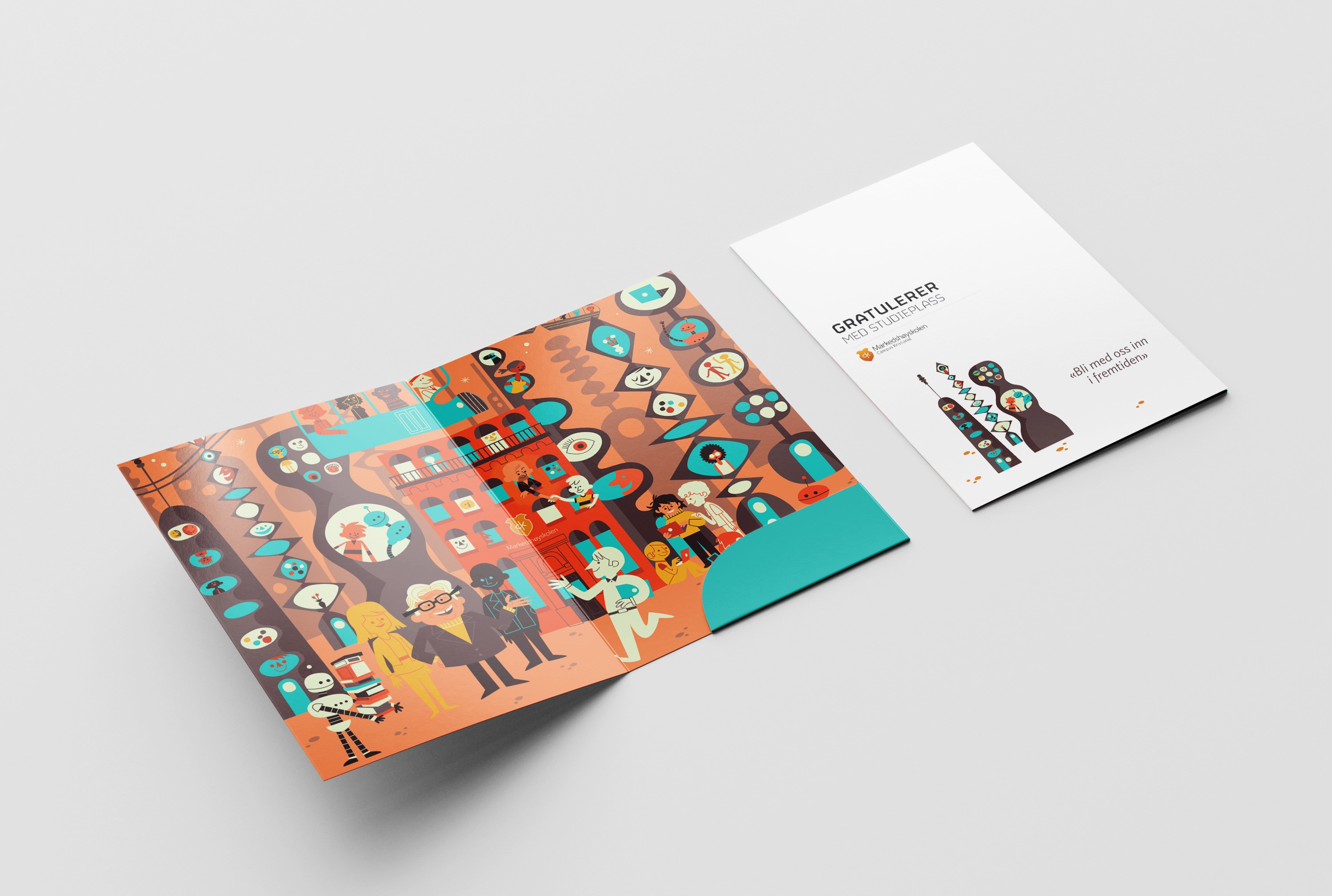 Utgangspunkt var fra byråets konsept og jeg hadde ansvar for utforming av studiekatalog og messedesign. Målet var å sikre en visuell helhet og tydelig kommunikasjon på tvers av både digitale og trykte kanaler.